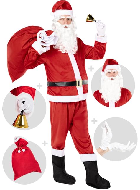 Inkluderet: Kostume: Jakke, bukser, bælte, støvlebetræk og hat. Tilbehør: Paryk med skæg og øjenbryn, handsker, sæk og klokke